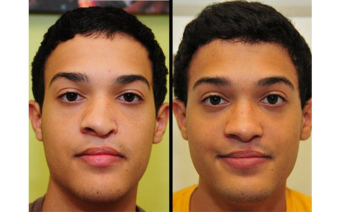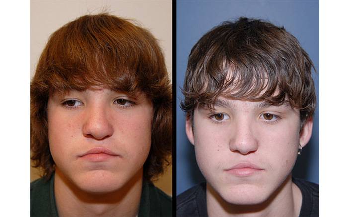 17 yo male with left-sided cleft lip and palate who had severe nasal deformity with the right nostril much larger than the left. He had correction of his deviated nose and straightening of the septum to help him breathe better (septorhinoplasty). He also had a minor revision of his cleft lip scar. This photo was taken about 3 weeks after his surgery.
