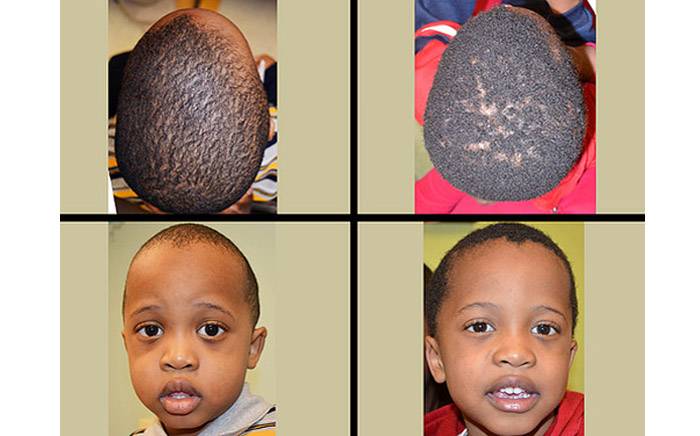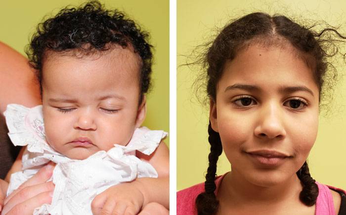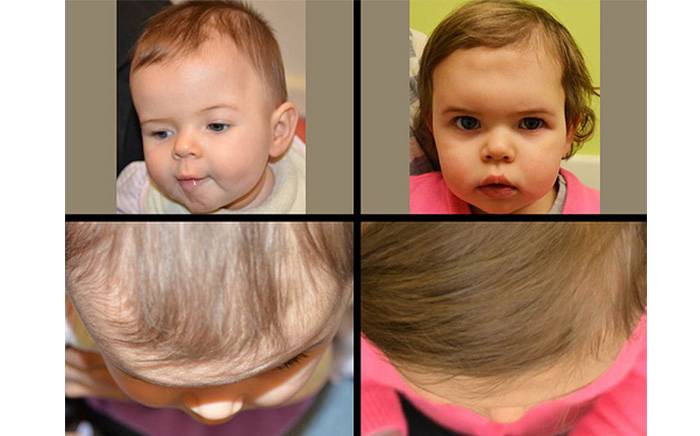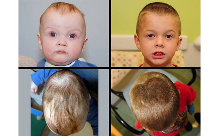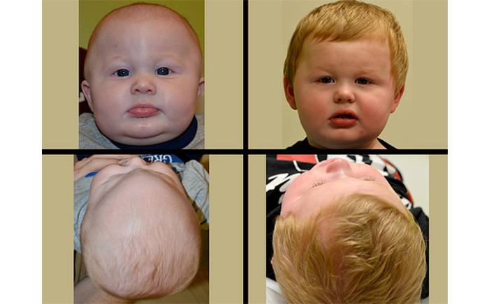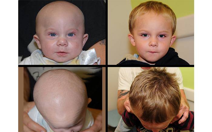 Child with sagittal synostosis before surgery (left). Postoperative 1 year after open reconstruction with increase in head width (right).