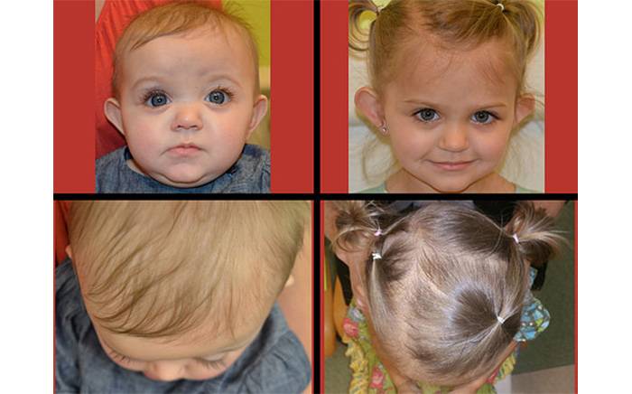 Before and after photos of three-year-old with sagittal and lambdoid synostosis 1 year after open reconstruction with a more normal head shape.