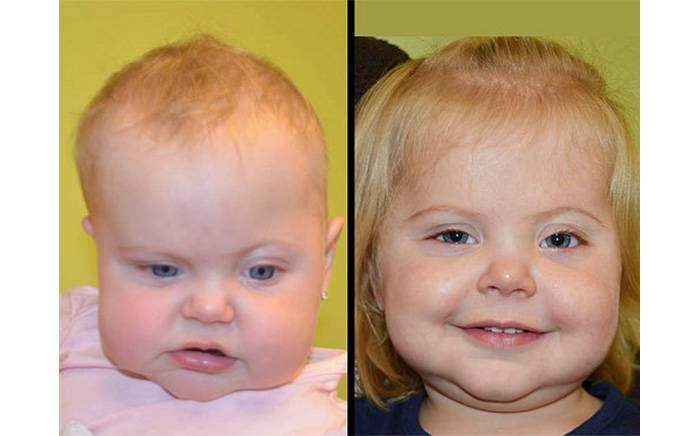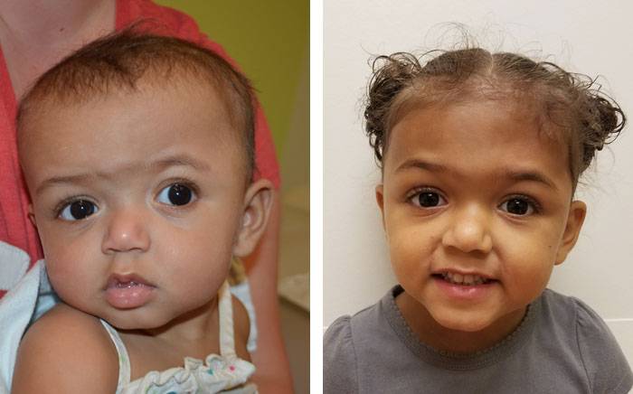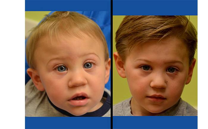 Child was born with left coronal synostosis (left). One year after open synostosis repair at St. Louis Children's Hospital (right).