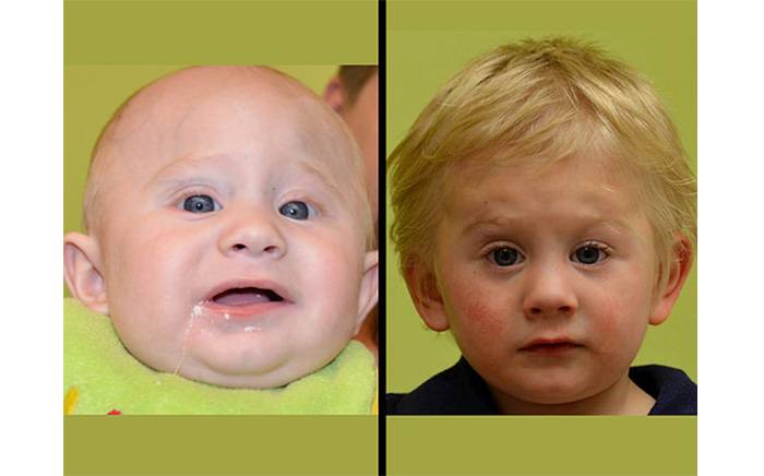 Child was born with metopic synostosis (left). (right) One year after open craniosynostosis repair at St. Louis Children's Hospital.