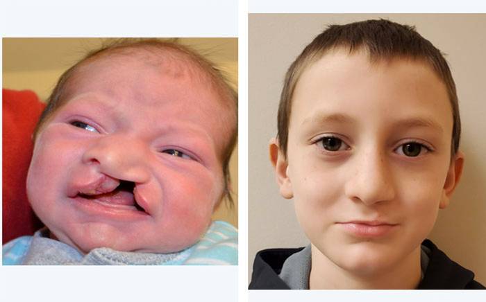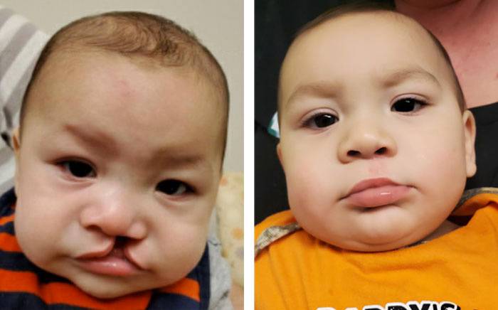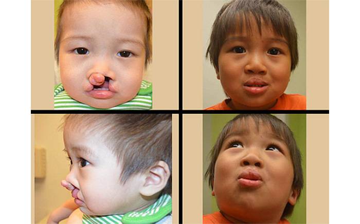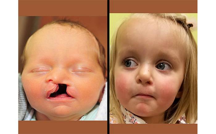 Child with a bilateral complete cleft lip and palate (left). 1 year after cleft lip and nose repair (right).