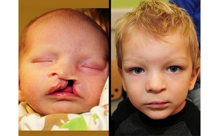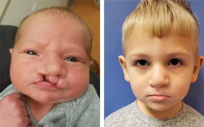 Child with a bilateral asymmetric cleft lip and palate. Follow-up photo is after repair of his lip, nose and palate.