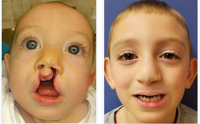 (Left) Child with a bilateral cleft lip and palate. (Right) 5-year-old after bilateral cleft lip and nose repair.