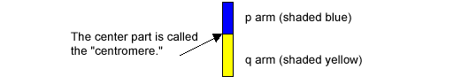 Each chromosome has many segments. These are usually divided into a "short arm" and a "long arm" of the chromosome. The short arm, which is the upper half of the chromosome, is known as the "p arm." The long arm, which is the lower half of the chromosome, is the "q arm." The centromere is the center part of a chromosome that appears "pinched" between the p and q arms.