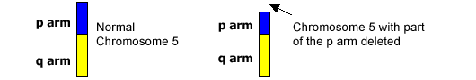 The term "deletion" simply means that a part of a chromosome is missing or "deleted." A very small piece of a chromosome can contain many different genes. When genes are missing, there may be errors in the development of a baby, since some of the "instructions" are missing. One example of a genetic syndrome caused by a deletion is called "Cri du Chat," where part of the #5 chromosome is missing or deleted.