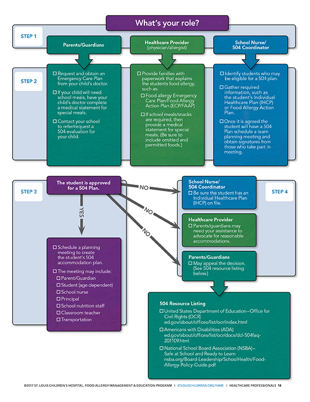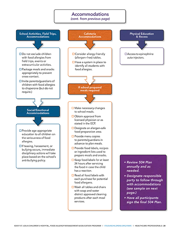 A 504 Plan is a written management plan developed on a case by case basis. Individual accommodation(s) will vary based upon each student’s individual needs, and may require input from their healthcare provider. Examples of 504 accommodations may include, but not be limited to, special seating arrangements, curriculum adjustments, field trips, special school events and staff training. Parents/guardians are within their rights to request an evaluation for eligibility and to pursue such a plan. All schools subject to this law should have a 504 Coordinator on staff who can help parents/guardians throughout the 504 process.