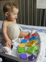 In Blair’s case, she didn’t need to be hospitalized for the “paint and wait.” However, as her treatment progressed, Tiffany grew concerned at the appearance of Blair’s abdomen. “While the skin had grown over the omphalocele, we noticed that everything was gradually pushing back out of her abdomen when we removed the compression bandage.”