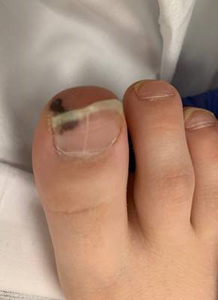 - Skin: purpuric macules on distal toes