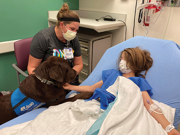 St. Louis Children’s partnered with Duo Dogs, Inc. to receive a chocolate Labrador retriever named Duo Dog Casey, the first facility dog, in February 2020. Trained by Duo Dogs, a local nonprofit organization that places facility dogs to serve physically, psychologically or socially vulnerable populations, his timing was impeccable as the COVID-19 pandemic hit shortly after. Assigned to a team of handlers, Casey has been working five days per week to provide support to patients and staff since his arrival. Thanks to donor support from corporate partner Purina, Casey’s care, including insurance and health expenses, is covered, which is essential in ensuring he remains healthy and safe to support our patients.