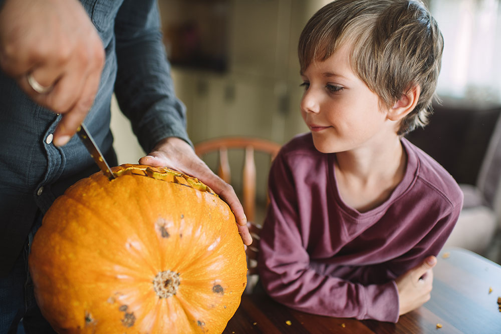 For those with older children who do carve, make sure your tools and your pumpkin are dry. Any moisture can lead to slipping, causing injury. Always carve your pumpkin on a flat surface in a well-lit area. Finally, know that sharper doesn't mean better. Very sharp knives often become stuck in the pumpkin, requiring force to remove them, and sometimes leading to injury. Use smaller, serrated pumpkin-carving knives because they are less likely to get stuck and easier to remove if they become lodged in a pumpkin.