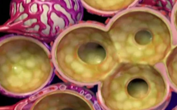 During normal respiration, air travels through the nose, down the trachea, and into smaller and smaller airways called bronchi. The bronchi divide into bronchioles and finally into tiny grape-like clusters of thin, fragile sacs called alveoli. In the alveoli, oxygen is exchanged for carbon dioxide in the blood.