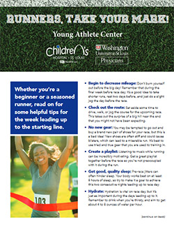 Download our Race Day TipsBegin to decrease mileage: Don’t burn yourself out before the big race. Remember that during the final week before race day, it’s a good idea to take shorter runs, rest two days before and do no more than a light jog the day before the race.