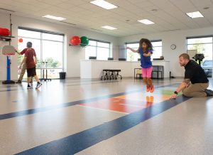 “For instance, the occupational therapy and speech therapy rooms are purposely designed to have less stimulation and distractions so that our patients can better concentrate. The rooms also are insulated to reduce noise and have lights that can be dimmed,” says Becker. “In the gym, we’ve built measurements into the floor for various tests we routinely perform, all designed specifically for pediatrics.”