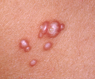 - Small bumps with a waxy or pearl-colored, smooth surface