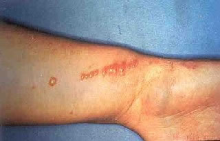 - Rash found on exposed body surfaces (such as the hands). Also, can be on areas touched by the hands. Areas that can be affected in this way are the face or genitals.