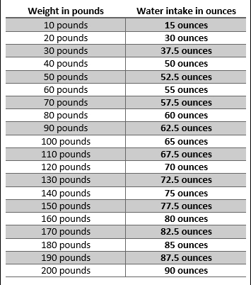 Children weighing over 40 pounds should drink at least 50 ounces of water daily and another .25 ounces per pound of body weight above 40 pounds. The table below shows how much water your child should be drinking. It is important to note that these recommendations are for normal daily intake and may need to be increased as activity levels increase.